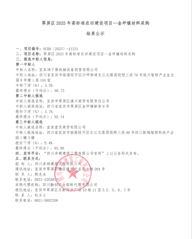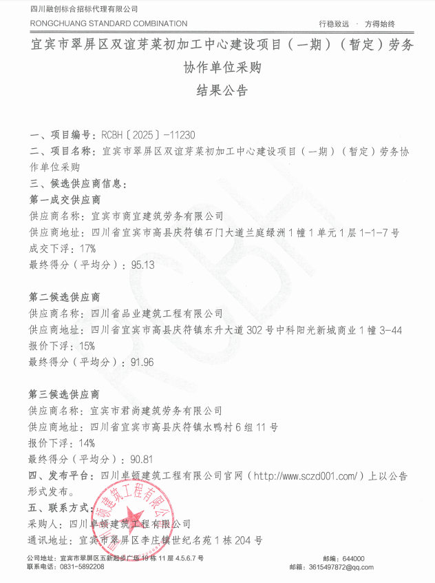 投标邀请公告四川融创标合招标代理有限公司受四川卓顿建筑工程有限公司(以下简称“招标人”)委托,参照《中华人民共和国政府采购法》等有关规定,采用公开招标方式,为委托方的宜宾市翠屏区城乡供水一体化建设项目(一期)-象鼻水厂劳务协作单位采购组织采购,兹向全国邀请符合本次采购要求的投标人参加投标。
